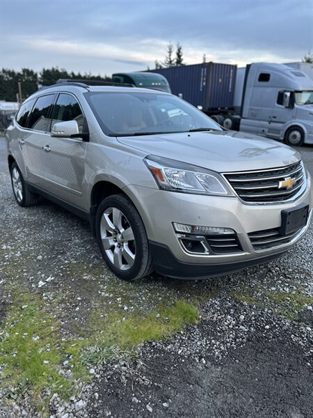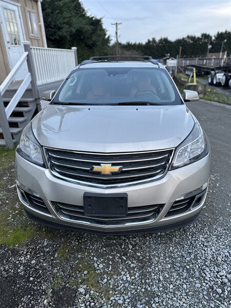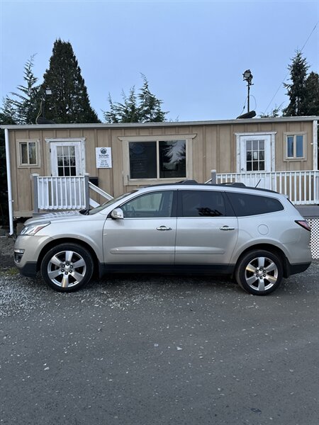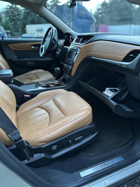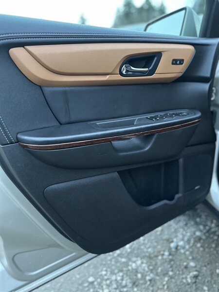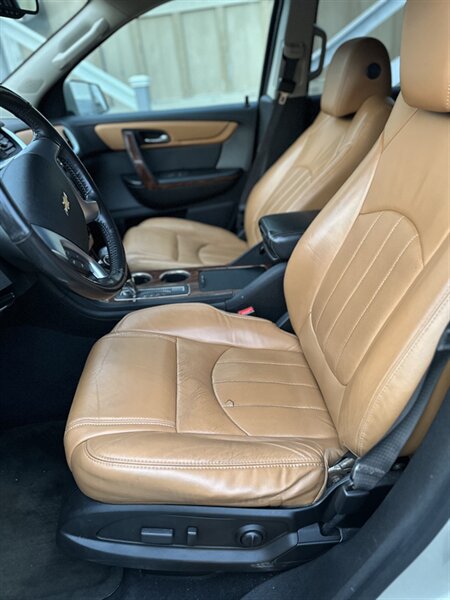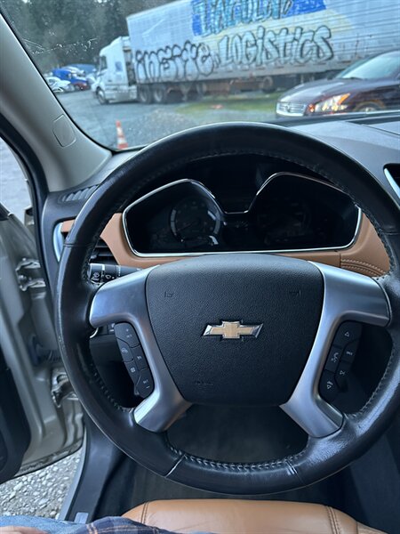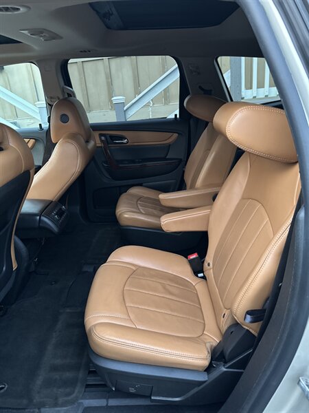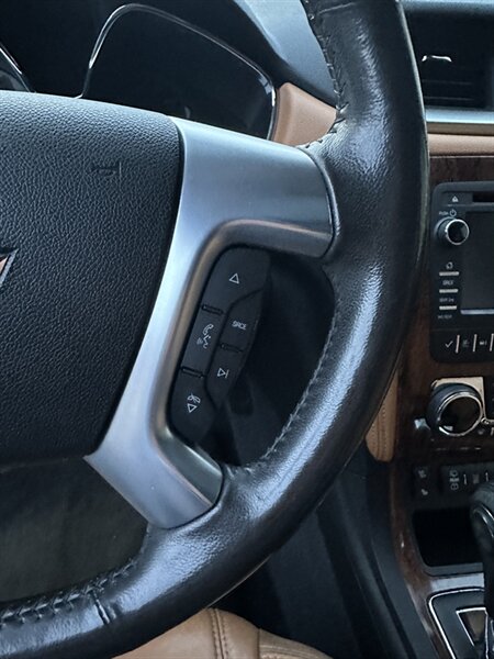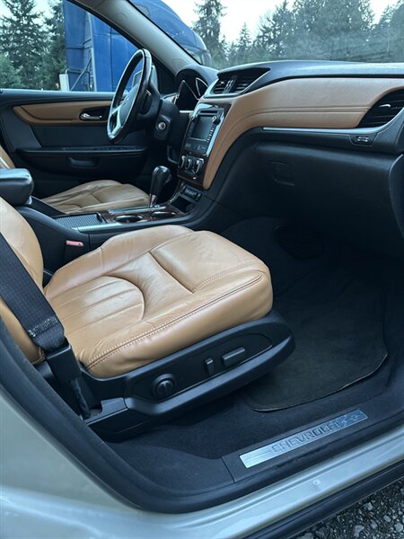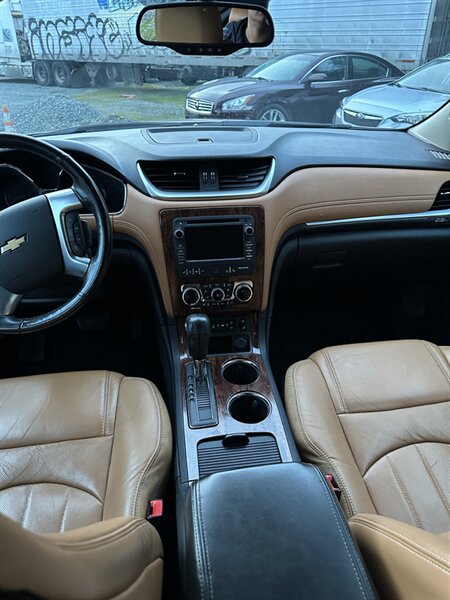 2014 Chevrolet Traverse LTZ in Black with a Black interior, comes with a Remote Start and a Heated Steering Wheel, powered by the factory 3.6L V6 producing 288 hp and 270 lb-ft, mated to a six-speed automatic (16 MPG city / 23 MPG highway). The LTZ is factory-equipped with leather-appointed seating for seven with third-row seating and split-folding second- and third-row seats, power-adjustable front seats with lumbar and memory, and heated front seats. Comfort and convenience features include tri-zone automatic climate control, a power liftgate, keyless entry/remote start, roof rails, and steering-wheel-mounted audio and cruise controls. Technology and safety are handled by a touchscreen infotainment system with Bluetooth, USB/Aux inputs, a rearview camera, OnStar capability, and a premium audio system. This vehicle is in excellent overall condition.