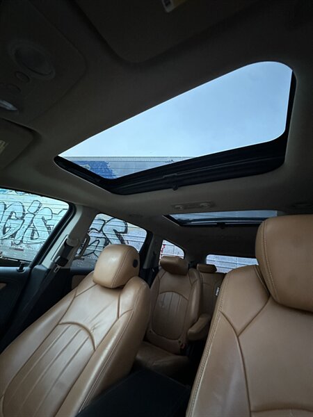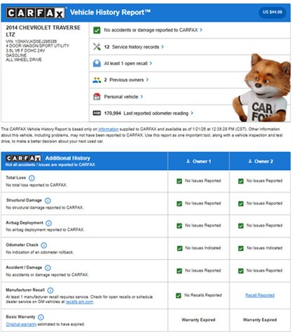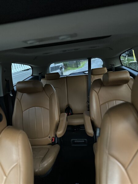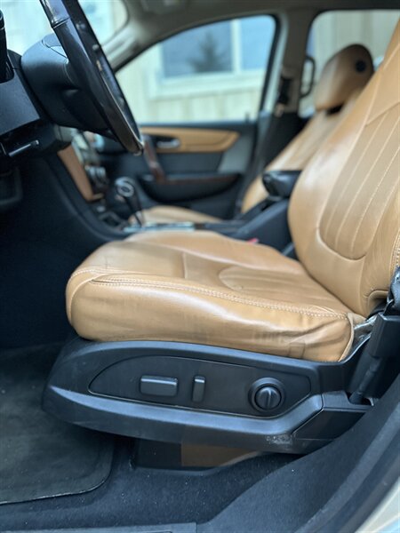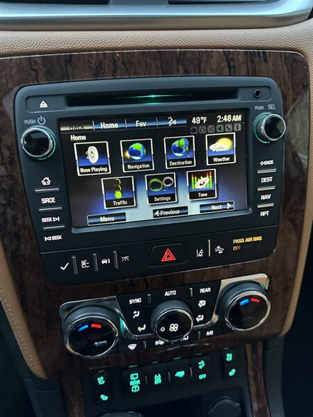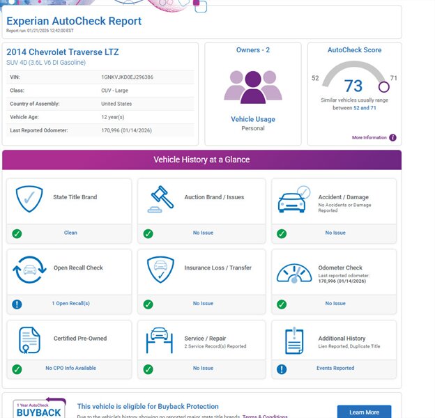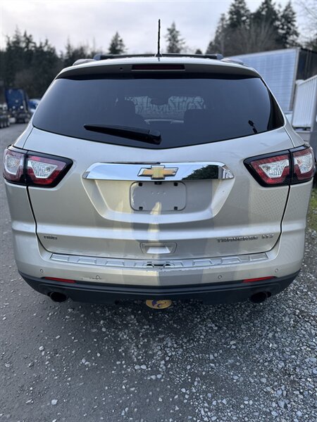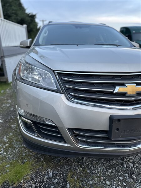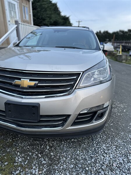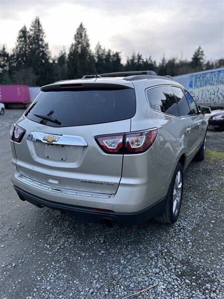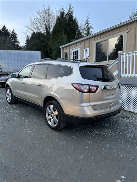 2014 Chevrolet Traverse LTZ in Black with a Black interior, comes with a Remote Start and a Heated Steering Wheel, powered by the factory 3.6L V6 producing 288 hp and 270 lb-ft, mated to a six-speed automatic (16 MPG city / 23 MPG highway). The LTZ is factory-equipped with leather-appointed seating for seven with third-row seating and split-folding second- and third-row seats, power-adjustable front seats with lumbar and memory, and heated front seats. Comfort and convenience features include tri-zone automatic climate control, a power liftgate, keyless entry/remote start, roof rails, and steering-wheel-mounted audio and cruise controls. Technology and safety are handled by a touchscreen infotainment system with Bluetooth, USB/Aux inputs, a rearview camera, OnStar capability, and a premium audio system. This vehicle is in excellent overall condition.