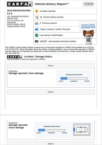 2014 Nissan Maxima 3.5 S finished in Black with a Black interior, powered by a 3.5L V6 producing 290 hp and 261 lb-ft of torque. Includes custom floor mats, Factory-standard features include power windows, locks and mirrors, remote keyless entry with Nissan Intelligent Key and push-button start, dual-zone automatic climate control, power-adjustable front seats with lumbar support, a leather-wrapped steering wheel with audio and cruise controls, Bluetooth hands-free phone and audio streaming, USB/AUX inputs and AM/FM/CD audio, 18-inch alloy wheels, automatic headlights, anti-lock brakes (ABS) with electronic stability and traction control, multiple airbags including front and side-impact and side-curtain protection, and a tire pressure monitoring system. EPA rating: 19 MPG city / 26 MPG highway. This vehicle is in excellent overall condition.