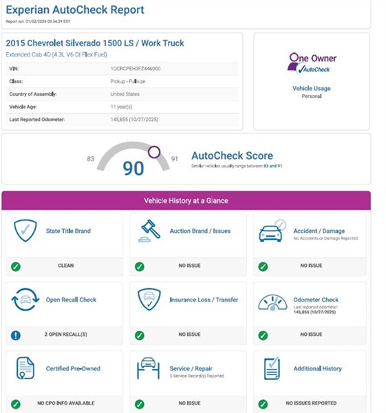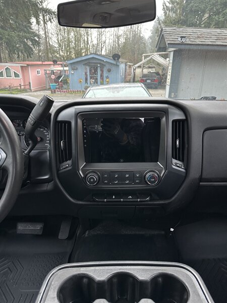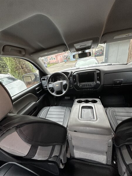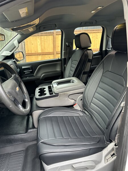 2015 Chevrolet Silverado 1500 LS — equipped with custom apple carplay with OEM fitment, white exterior, black nappa leather seat covers, excellent overall condition. Powered by the EcoTec3 4.3L FlexFuel V6 (285 hp, 305 lb-ft) paired with a six-speed automatic transmission. Factory-equipped with comfortable grey cloth seating and folding center armrest, air conditioning, cruise control, power windows and door locks, remote keyless entry, AM/FM/CD audio with auxiliary/USB inputs and steering-wheel audio controls, tilt steering, and durable steel bed. Safety features include ABS, electronic stability/traction control, multiple airbags and tire pressure monitoring.