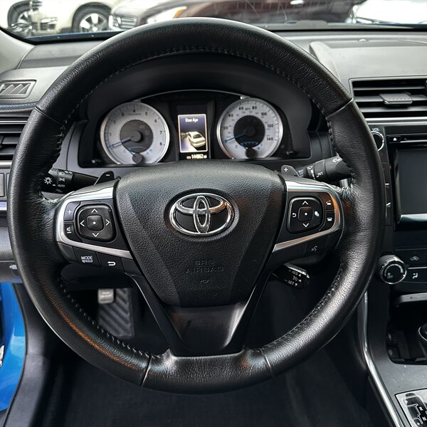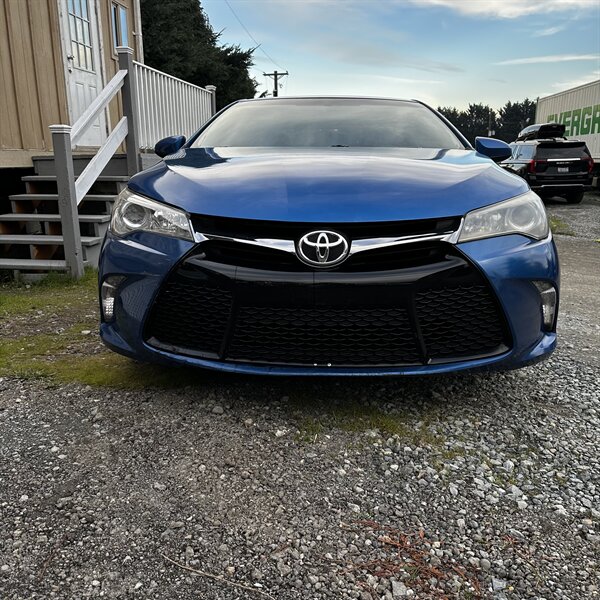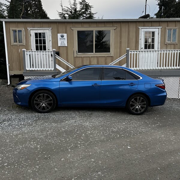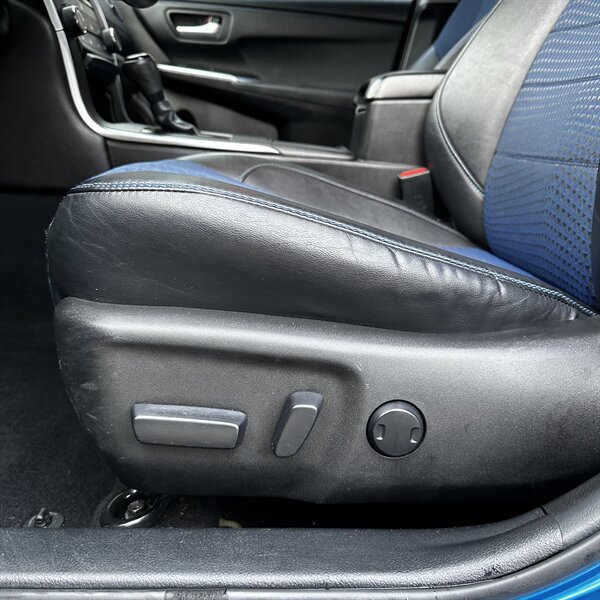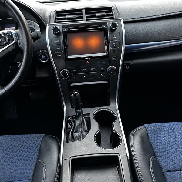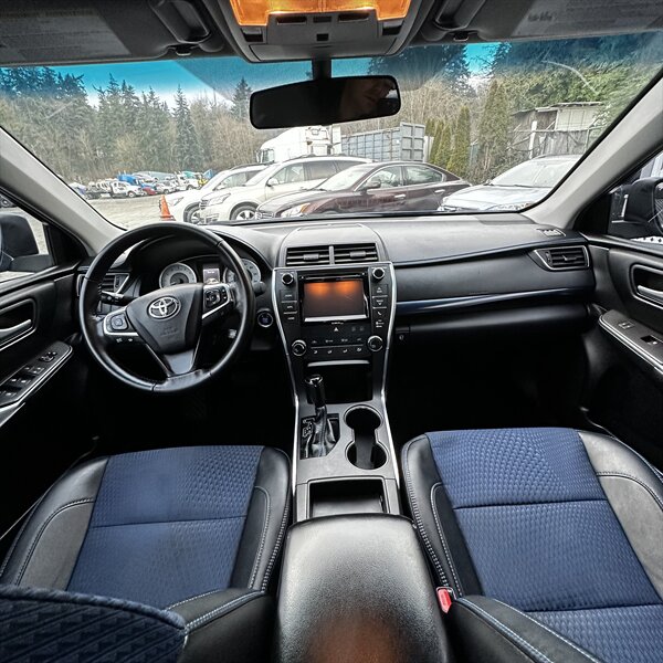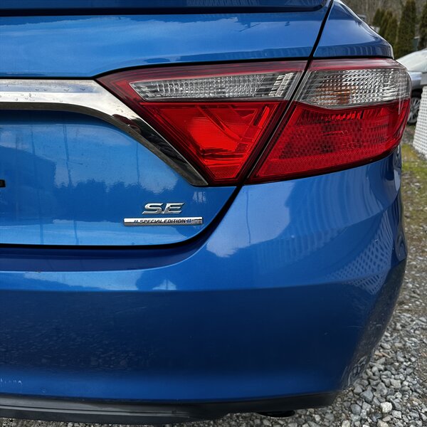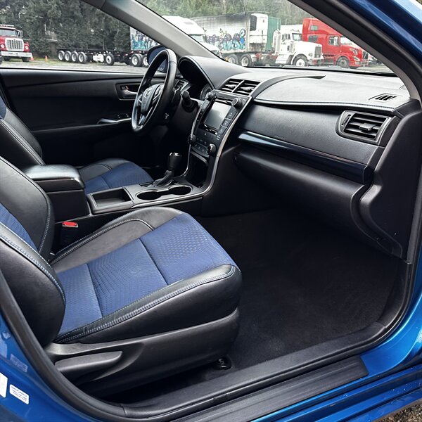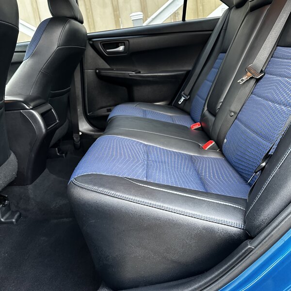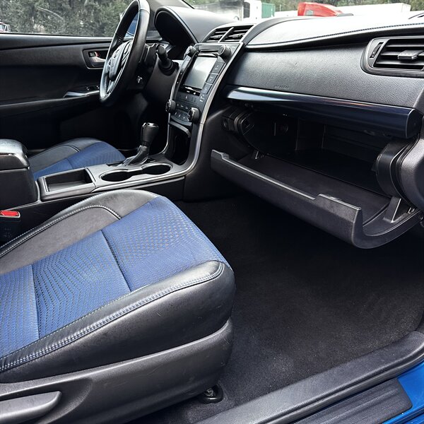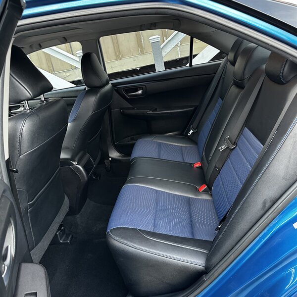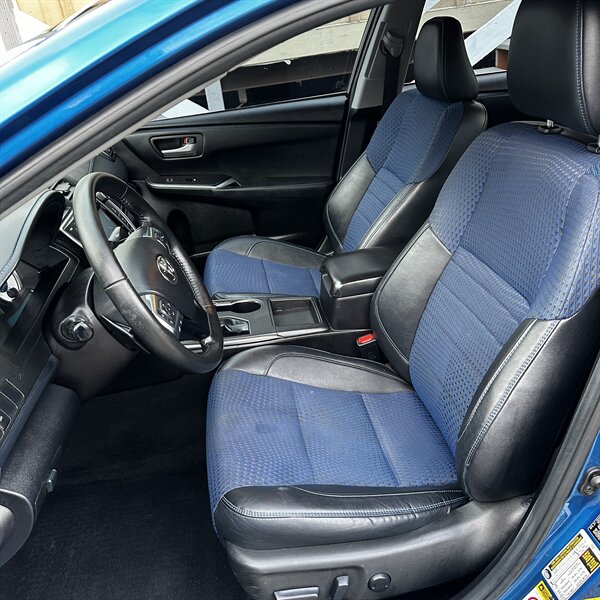 Clean, sporty 2016 Toyota Camry Special Edition in Blue with a Black-and-Blue interior — excellent overall condition. Powered by a 2.5L I4 producing 178 hp and 170 ft.-lbs., paired with a smooth 6-speed automatic (FWD) and rated at 25 MPG city / 35 MPG highway. Factory-standard features include cloth sport-trim seats with blue accents, alloy wheels, power windows/locks/mirrors, remote keyless entry, cruise control, air conditioning, tilt/telescoping steering wheel, steering-wheel audio controls, Bluetooth hands-free, USB/AUX inputs with Toyota’s infotainment system, and a full complement of safety gear (ABS, stability/traction control, multiple airbags, and tire pressure monitor). Ready for a test drive — friendly, reliable, and economical.