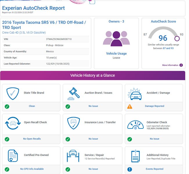 2016 Toyota Tacoma SR5 V6 finished in Barcelona Red Metallic with a Cement Gray interior. Powered by a 3.5L V6 producing 278 hp and 265 lb-ft of torque, paired with a 6-speed automatic transmission, and rated at 19 MPG city / 24 MPG highway. Vehicle is in excellent overall condition.